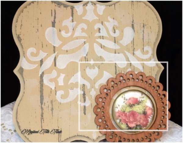 Aztán készült még egy kis táblácska, amin lazúroztunk, festettünk, koptattunk, majd stencileztünk és készült még egy rátét fából, aminek a belsejébe egy kis porcelán betétet készítettünk.