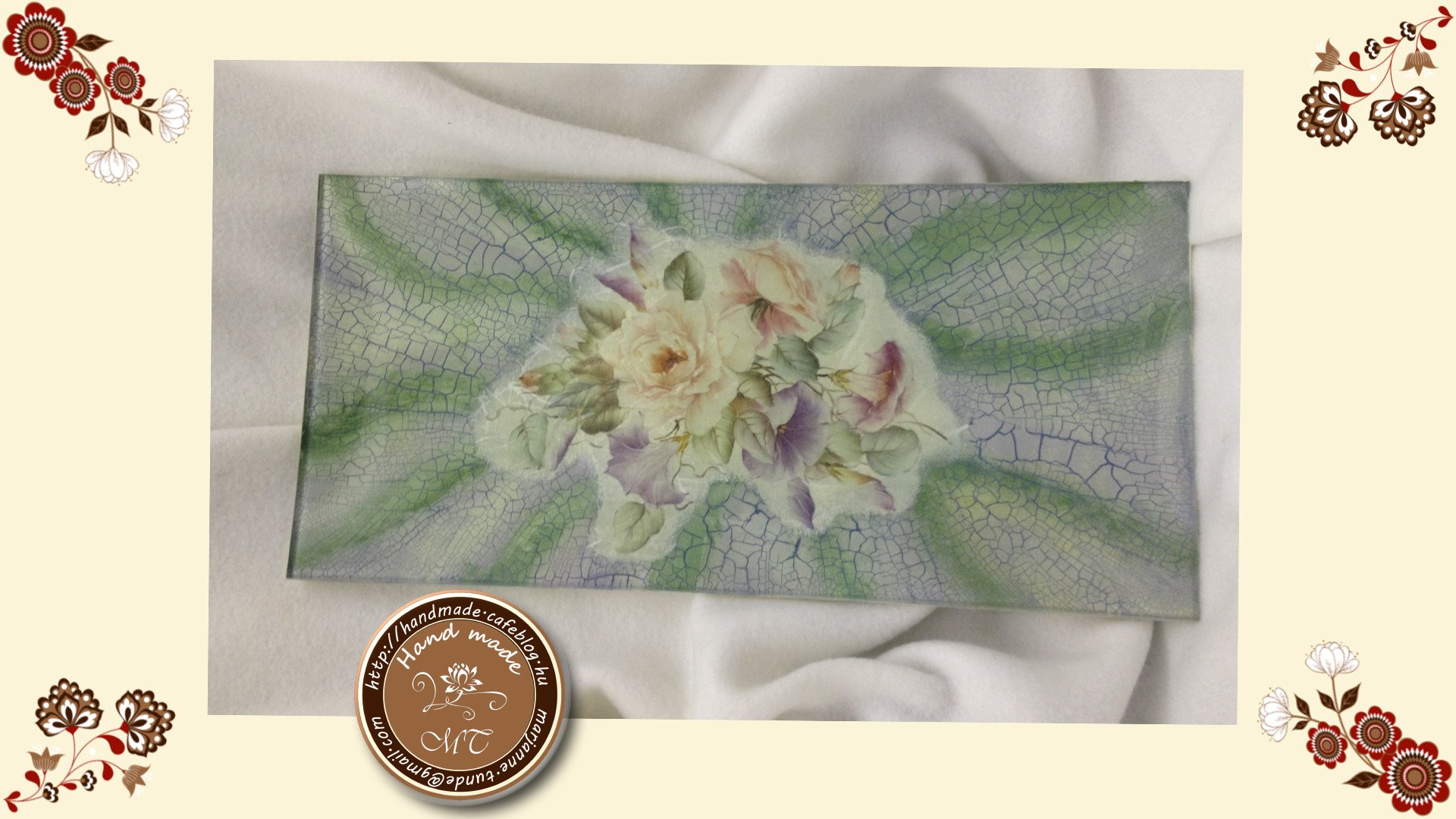 Az üvegtál alapos tisztítása után a rizspapírból kitéptem a mintát és felragasztottam az üveg hátuljára. Üvegtál esetében nagyrészt a hátuljára dolgozom, mert így a tál meg marad teljes értékű üvegtálnak és nyugodtan használható, akár sütihez, akár a kulcsokat beledobni… bármire. A száradás után 2 fázisú finomvonalas repesztő került rá. Mind két réteget úgy kell felhordani, hogy egyenletes…